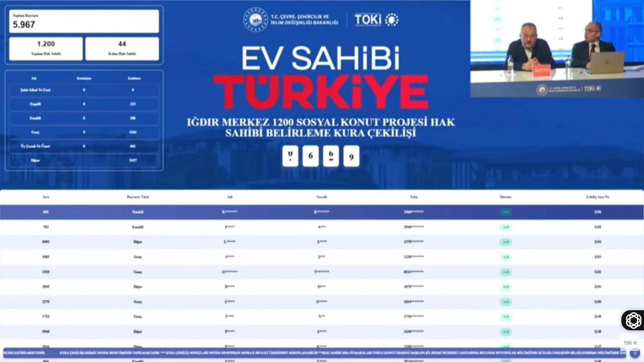 Bugün saat 11:00'de başlayan kura çekilişi töreniyle start aldı. Konuşmaların ardından kura işlemine geçildi. İlk kura işlemleri öncelik tanınan branşlar için oldu. Kura çekilişi sonuçları canlı yayın üzerinden duyuruldu. Akşam saatlerinde ise TOKİ Iğdır merkez kura sonuçları e-devlet turkiye.gov.tr üzerinden TOKİ Başvuru ekranından sorgulanabilecek. Ayrıca TOKİ resmi web sitesi toki.gov.tr üzerinden sonuçlar açıklanacak. Kura çekilişini altta verdiğimiz YouTube canlı yayın ekranından izleyebilir, sonuçlara ulaşabilirsiniz.