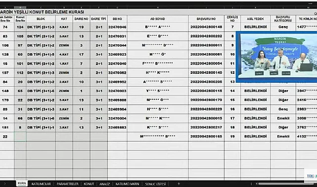 TOKİ Mardin Yeşilli konut projesi kapsamında hayata geçirilen 125 daire için hak sahipliği konut belirleme kura çekilişi sonuçları canlı yayında Noter huzurunda yapılırken, kurada konutları belirlenen isimler açıklandı. Mardin Yeşilli TOKİ için hak sahiplerinin konutları belirlenirken, konutların konumları da belirlenmiş oldu.