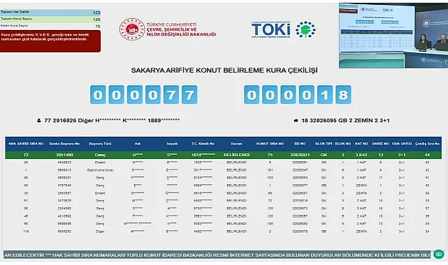 TOKİ Sakarya Arifiye sosyal konut projesi kapsamında yer alan toplam 126 adet 2+1 ve 3+1 daireler için kura çekilişi heyecanı yaşandı. TOKİ Sakarya Arifiye projesinde 126 adet 2+1 ve 3+1 dairenin hak sahiplerinin konut belirleme kura çekilişi 123 başvuru arasından Noter huzurunda canlı yayında belirlendi.