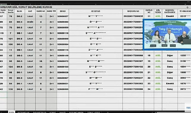 TOKİ Diyarbakır Eğil konut projesinde 126 daireden oluşan 2+1 ve 3+1 evler için toplamda 126 başvuru arasında kura çekilişi hak sahipliği belirleme işlemi gerçekleşti. Kura çekilişi sonuçları idare tarafından YouTube üzerinden yayınlanan canlı yayından takip edilebilir veya resmi web sitesinden görülebilir. Kura sonuçları isim sorgulama ekranı akşam saatlerinde TOKİ resmi web sitesi üzerinden yayınlanacağı kaydedildi.