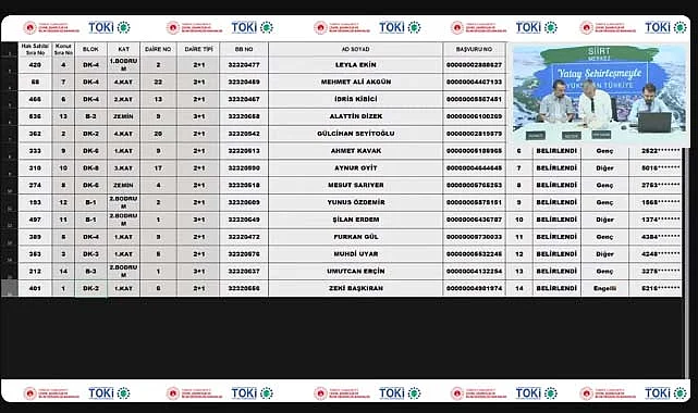 TOKİ Siirt Merkez 2+1 kura sonuçları ile TOKİ Siirt Merkez 3+1 kura çekilişi sonuçları isim listelerini altta canlı yayın videosundan veya ilgili TOKİ haberinden inceleyebileceksiniz.