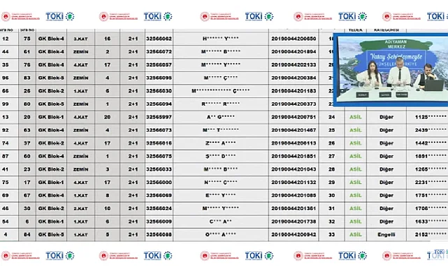 Adıyaman Merkez TOKİ 99 adet 2+1 daire seçeneği için 99 hak sahibi yer alırken, 45 adet 3+1 daire için ise 45 hak sahibi kura çekiminde yer aldı. Hak sahiplerinin konutları Noter huzurunda, canlı yayında belirlenmiş oldu.