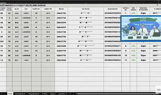 Konut belirleme işlemi YouTube canlı yayında Noter huzurunda gerçekleştirildi. TOKİ Elazığ Maden projesi kapsamında toplamda 144 adet evin hak sahipliği konut belirleme kurası tamamlanarak ev sahiplerine anahtarların kısa süre sonra teslim edileceği kaydedildi. Kura sonuçları isim listeleri ise e-devlet TOKİ Başvuru ekranı ile toki.gov.tr'den akşam saatlerinde yayınlanacak.