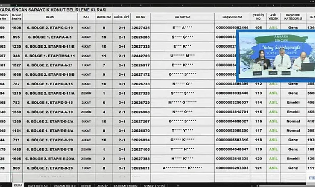 TOKİ Ankara Sincan Saraycık konut projesi kapsamında hayata geçirilen 1739 daire için hak sahipliği konut belirleme kura çekilişi sonuçları canlı yayında Noter huzurunda yapılırken, kurada konutları belirlenen isimler açıklandı. Ankara Sincan Saraycık TOKİ için hak sahiplerinin konutları belirlenirken, konutların konumları da belirlenmiş oldu.