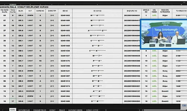 Noter huzurunda canlı yayın üzerinden izlenen TOKİ Ankara Bala konut projesinde yer alan 18 adet dairenin hak sahipliği konut belirleme kura çekilişi tamamlanmış oldu. Kura çekilişi sonuçları ise akşam saatlerinde e-devlet üzerinden açıklanacak.