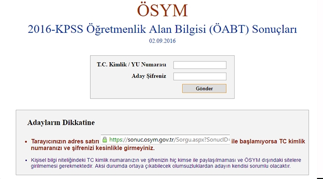 2016-KPSS Öğretmenlik Alan Bilgisi (ÖABT) Sonuçlarının erişime açıldığı ifade edilirken, bu kısa haberimizin sonunda sınav sonuçlarına dair sorgu ekranına gitmeniz ve sorgu yapabilmeniz için ilgili bağlantı hazırlandı. Bu kapsamda ÖSYM resmi sonuçları açıklanan web sitesinde şu uyarıya dikkat etmeniz gerekmekte;