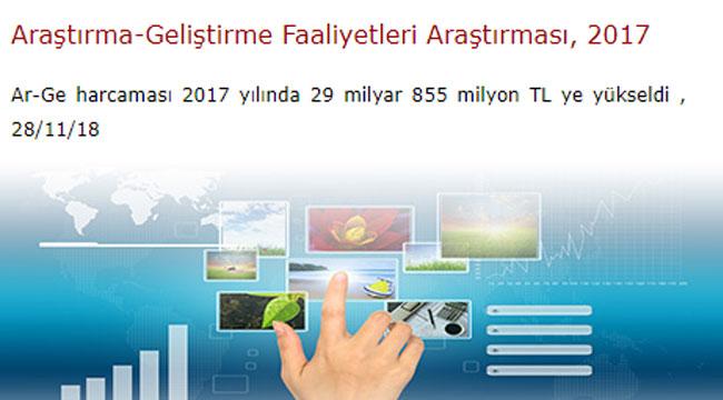Gayrisafi yurtiçi Ar-Ge harcaması 2017 yılında bir önceki yıla göre 5 milyar 214 milyon TL artarak, %21,2 artışla 29 milyar 855 milyon TL'ye yükseldi.