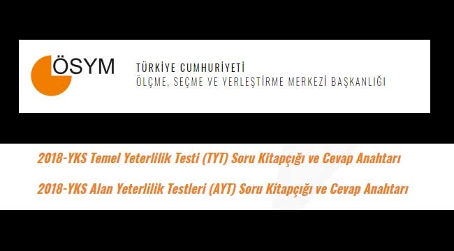 30 Haziran 2018 tarihinde uygulanan 2018-YKS 1. Oturum Temel Yeterlilik Testi (TYT) ve 1 Temmuz 2018 tarihinde uygulanan 2018-YKS 2. Oturum Alan Yeterlilik Testleri (AYT) Soru Kitapçıklarına, 1 Temmuz 2018 tarihinde saat 18.00’dan itibaren aşağıdaki bağlantılardan erişilebilir.
