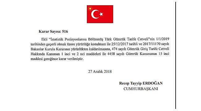 Konuyla ilgili yayımlanan duyuruda, Ekli İstatistik Pozisyonlarına Bölünmüş Türk Gümrük Tarife Cetvelinin 1/1/2019 tarihinde geçerli olmak üzere yürürlüğe konulması ile 25/12/2017 tarihli ve 2017/11170 sayılı Bakanlar Kurulu Kararının yürürlükten kaldırılmasına, 474 sayılı Gümrük Giriş Tarife Cetveli Hakkında Kanunun 1 inci ve 2 inci maddeleri 4458 sayılı gümrük Kanununun 15 inci maddesi gereğince kararlaştırılarak Cumhurbaşkanı Erdoğan'ın imzası ile Resmi Gazete'de duyuruldu.