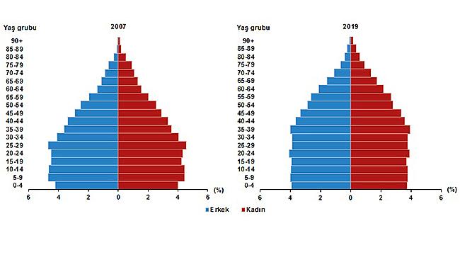 Nüfus piramitleri, nüfusun yaş ve cinsiyet yapısında meydana gelen değişimi gösteren grafikler olarak tanımlanmaktadır. Türkiye'nin 2007 ve 2019 yılı nüfus piramitleri karşılaştırıldığında, doğurganlık ve ölümlülük hızlarındaki azalmaya bağlı olarak, yaşlı nüfusun arttığı ve ortanca yaşın yükseldiği görülmektedir.