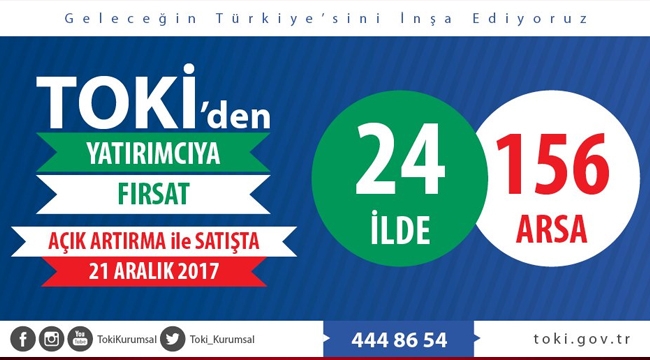 Başbakanlık Toplu Konut İdaresi Başkanlığı (TOKİ), Adana, Afyonkarahisar, Ankara, Balıkesir, Batman, Bilecik, Bitlis, Diyarbakır, Düzce, Edirne, Elazığ, Eskişehir, Giresun, İstanbul, İzmir, Kayseri, Kocaeli, Manisa, Ordu, Sakarya, Samsun, Siirt, Tekirdağ ve Van’da toplam 1.206.890,63 m2 büyüklüğünde 156 adet arsayı (konut, ticaret, sanayi, sosyo-kültürel tesis, merkezi iş, tali iş, çarşı, iş ve alışveriş merkezleri, konaklama tesisi, özel kreş, özel eğitim, özel sağlık, konut dışı kentsel çalışma, kentsel dönüşüm, akaryakıt istasyonu niteliğinde) yaklaşık 1.091.000.000 TL muhammen bedel ve “Açık Artırma” yöntemi ile satışa sundu.