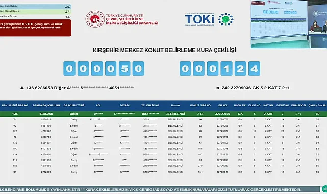 Kırşehir Merkez Kındam Mahallesi TOKİ kurasına katılan başvuru sahipleri için konutlar Noter huzurunda, YouTube canlı yayınında belirlenmiş oldu. TOKİ kura sonuçları isim sorgulama ekranı TOKİ resmi web sitesi ve e-devlet üzerinden öğrenilebilir.