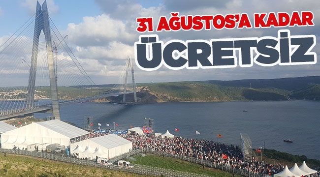 Türkiye'nin gururu Yavuz Sultan Selim Köprüsü'nün açılış töreninde İstanbullulara hitap eden Cumhurbaşkanı Erdoğan ücretsiz Köprü geçiş süresini açıkladı. 31 Ağustos gecesine kadar tüm araçlar ücretsiz olarak açılışı gerçekleştirilen köprüsnü kullanabilecek.