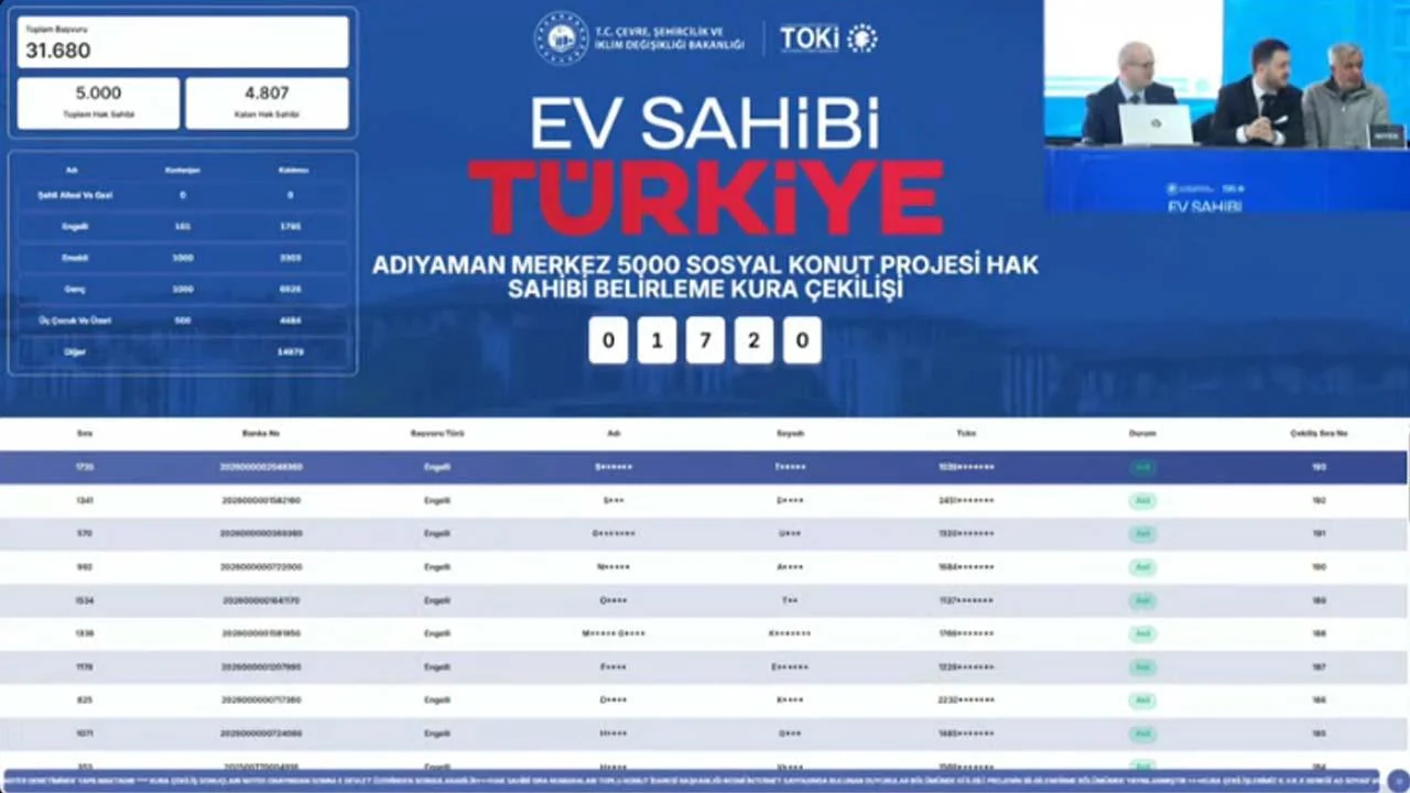 Adıyaman Merkez TOKİ kura sonuçları isim listesi sorgulama ekranı, kura tamamlandıktan sonra e-Devlet ve TOKİ’nin resmi internet sitesi üzerinden görüntülenebilecek. Törenle başlayan kura işlemi öncelikli vatandaşların kuralarıyla başladı, ilçelerin tamamlanmasıyla hak shaipleri belirlenmiş oldu.