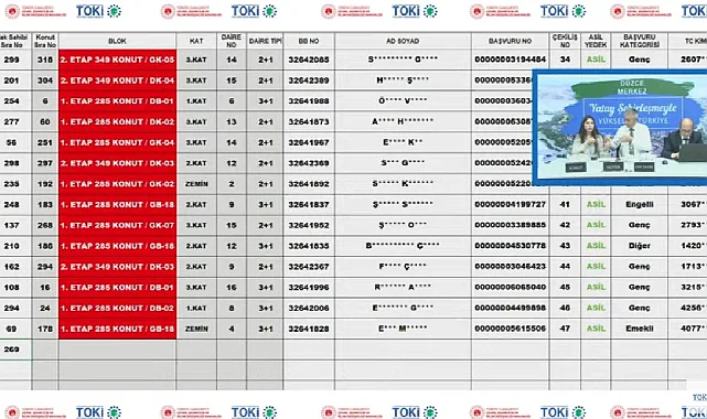 TOKİ Düzce Merkez konut projesi kapsamında hayata geçirilen 335 daire için hak sahipliği konut belirleme kura çekilişi sonuçları canlı yayında Noter huzurunda yapılırken, kurada konutları belirlenen isimler açıklandı. Düzce Merkez TOKİ için hak sahiplerinin konutları belirlenirken, konutların konumları da belirlenmiş oldu.