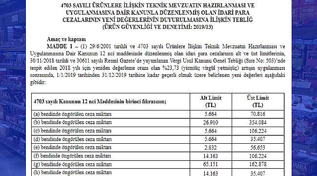 MADDE 1 – (1) 29/6/2001 tarihli ve 4703 sayılı Ürünlere İlişkin Teknik Mevzuatın Hazırlanması ve Uygulanmasına Dair Kanunun 12 nci maddesinde düzenlenmiş olan idari para cezalarının alt ve üst limitlerinin, 30/11/2018 tarihli ve 30611 sayılı Resmî Gazete’de yayımlanan Vergi Usul Kanunu Genel Tebliği (Sıra No: 503)’nde tespit edilen 2018 yılı için yeniden değerleme oranı olan %23,73 (yirmiüç virgül yetmişüç) artışın uygulanması sonrasında, 1/1/2019 tarihinden 31/12/2019 tarihine kadar geçerli olmak üzere belirlenen yeni değerleri aşağıdaki gibidir: