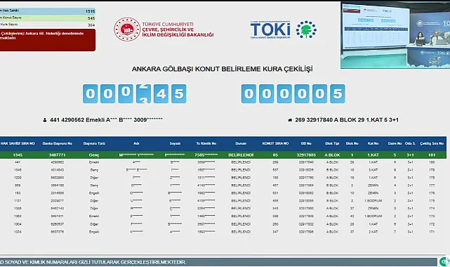 Öte yandan, Gölbaşı TOKİ projesinde de kura sonuçları açıklandı. Toplam 545 daire için 2+1 ve 3+1 tipindeki konutlara 1.516 başvuru yapıldı. Kura çekilişinde hak sahipleri belirlenirken, sonuçlarını öğrenmek isteyen vatandaşlar bu akşam saatlerinden itibaren toki.gov.tr veya e-Devlet üzerinden isim sorgulama ekranından kontrol edebilecek.