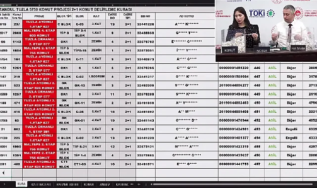 Toplu Konut İdaresi Başkanlığı (TOKİ) ülke genelinde yüz binlerce aileyi ev sahibi yaparken, sosyal konut projeleri ile barınma ihtiyacını gidermeye devam ediyor. Diğer taraftan başvuruları tamamlanan ve kura çekilişi yapılan toplu konut projelerinde konut belirleme ve hak sahipliği kuraları çekiliyor. Bugün TOKİ tarafından İstanbul'un Tuzla ilçesinde yer alan 5750 adet konutun hak sahipliği konut belirleme kurası yapıldı. 3+1 tipinde evlerin hak sahipleri kurada konutu belirlenen hak sahipleri isim isim açıklandı.
