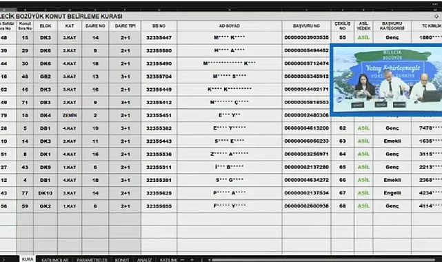 TOKİ Bilecik Bozüyük konut projesinde yer alan 80 adet daire için hak sahipliği konut belirleme kura çekilişi sonuçları canlı yayında Noter huzurunda gerçekleştirilirken, sonuçlar açıklandı. Bilecik Bozüyük TOKİ için hak sahiplerinin konutları belirlenirken, konutların konumları da belirlenmiş oldu.