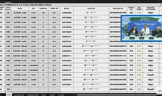 624 adet 2+1 daire için 544 başvuru, 257 adet 3+1 daire için ise 235 başvuru arasından Denizli Pamukkale TOKİ kura işlemi gerçekleştirildi. 881 daireli 2+1 ve 3+1 evler için toplamda 779 başvuru yapılan Denizli Pamukkale TOKİ projesinde hak sahipliği konut belirleme kurası tamamlandı. Kura çekilişi sonuçları idare tarafından YouTube üzerinden yayınlanan canlı yayından takip edilebilir veya resmi web sitesinden görülebilir. Kura sonuçları isim sorgulama ekranı akşam saatlerinde TOKİ resmi web sitesi üzerinden yayınlanacağı kaydedildi.