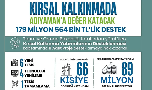 Tarım ve Orman Bakanlığı tarafından yürütülen Kırsal Kalkınma Yatırımlarının Desteklenmesi Programı kapsamında Adıyaman’da tarım sektörü ile iştigal eden yatırımcıların hazırladığı 11 adet proje uygun görülerek toplam 179 Milyon 564 TL’lik destek almaya hak kazandı.