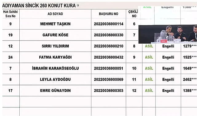 İdare Kura Sonuçları isim sorgulama ekranını açtı. Kura çekilişinde adı okunan Adıyamanlı vatandaşlar aşağıda bıraktığımız linkte yer alan haberde resmi kura sonuçları ekranına erişebilecek. Adıyaman TOKİ kura çekilişi sonuçları canlı isim sorgulama ekranından adını, Tc numarasını yazarak sorgulatabilecek.