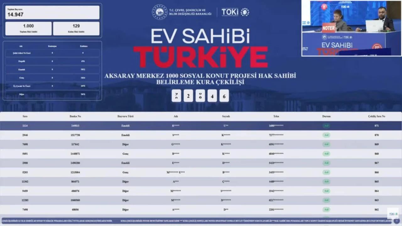 TOKİ Aksaray Merkez kura sonuçları 1000 daire için 14 bin 947 başvuru kabulü arasından çekildi. Kurada Aksaray Merkez TOKİ projesi kapsamında hak sahiplerinin isimleri belirlendi.