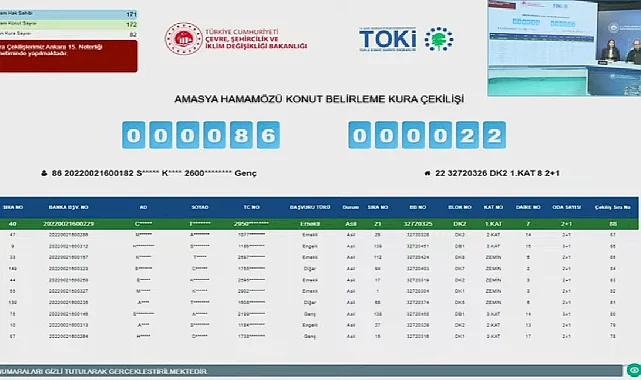 172 adet 2+1 ve 3+1 daire seçeneği bulunan Amasya Hamamözü TOKİ projesi kapsamında 171 başvuru arasından hak sahipliği konut belirleme işlemi yapıldı. Amasya Hamamözü TOKİ konut kura çekilişi sonuçları idare tarafından YouTube üzerinden yayınlanan canlı yayından takip edilebilir veya resmi web sitesinden görülebilir. TOKİ Amasya Hamamözü Kura sonuçları isim sorgulama ekranı akşam saatlerinde TOKİ resmi web sitesi üzerinden yayınlanacağı kaydedildi.