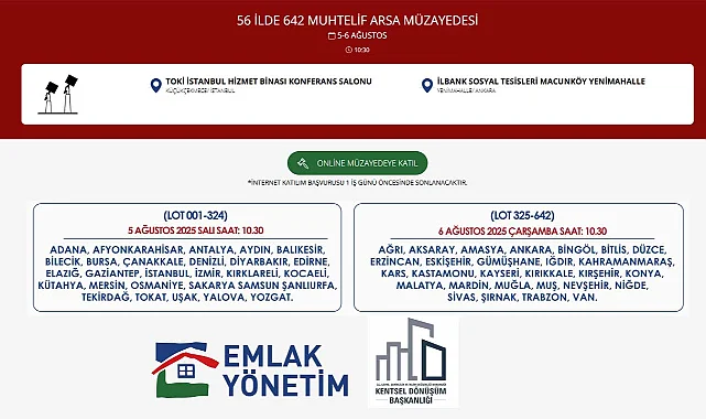 Çevre, Şehircilik ve İklim Değişikliği Bakanlığı Kentsel Dönüşüm Başkanlığı tarafından ülke genelinde 56 ili kapsayan 642 adet arsa için ihale yöntemiyle satış ilanı yayınlandı. Arsalar çeşitli büyüklüklerde ve farklı fiyat aralıklarında ihale yöntemiyle, açık artırmada satın alınabilecek. Arsaları görmek, fiyatları incelemek isteyenler ise emlakyönetim web sitesinde müzayede bölümünden tüm lotları inceleyebilir.