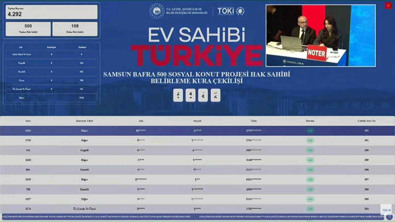 Samsun iline bağlı tüm ilçeler için TOKİ kura saonuçları açıklandı. 500 bin konut kampanyası dahilinde Samsun'da hayata geçirilecek evlerin hak sahipleri Bakan Kurum'un katılımıyla düzenlenen törenle gerçekleştirildi.