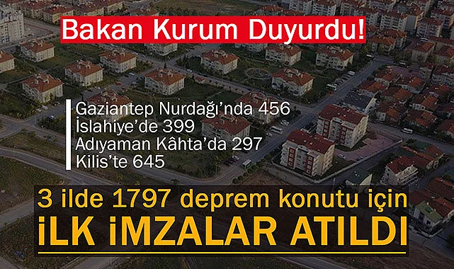 Çevre, Şehircilik ve İklim Değişikliği Bakanı Murat Kurum, deprem bölgelerinde aralıksız süren çalışmalara liderlik ederken, kalıcı konutların yapımı için TOKİ tarafından ilk sözleşmelerin imzalandığını duyurdu. Gaziantep ilinde Nurdağı ve İslahiye, Adıyaman Kahta ve Kilis illerinde deprem evleri için ilk imzalar atıldı.