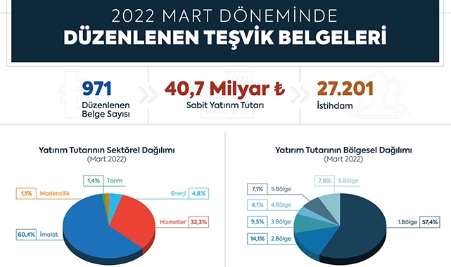 8 Mayıs tarihinde yayımlanan Resmi Gazete'de 2022 yılı Mart ayına ilişkin verilen teşvikler, yapılan yatırımlara ilişkin en son veriler paylaşıldı.