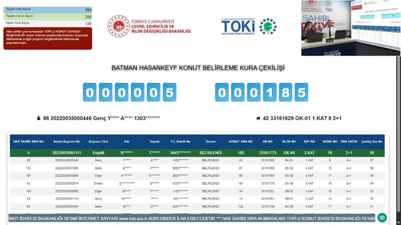 TOKİ projelerinde hak sahipliği konut belirleme işlemleri kesintisiz devam ediyor. Batman'da ev sahibi olmak isteyen Merkez ilçe ve Hasankeyfliler hak sahipliği konutları belirlendi.