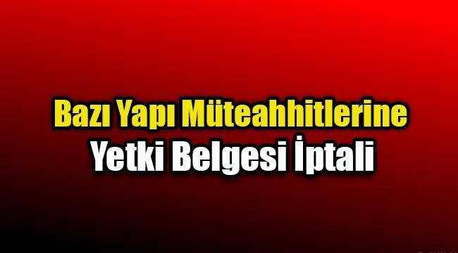 Çevre ve Şehircilik Bakanlığı Mesleki Hizmetler Genel Müdürlüğü tarafından 3194 Sayılı İmar Kanununun ilgili hükümlerine uygun olarak görev ve sorumluluklarını yerine getirmedikleri idarelerince tespit edilen aşağıdaki yapı müteahhitlerinin yetki belge numaraları, aynı Kanunun 42 nci maddesinin dokuzuncu fıkrası doğrultusunda, karşılarında yazılı Bakanlık Makamının Olurları ve sürelerle iptal edilmiştir.
