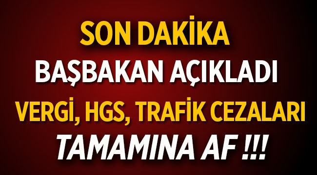 Milyonlarca mükellefi, vergi borçlusunu yakından ilgilendiren haber! Vergi affı gibi açıklama Başbakan Binali Yıldırım'dan geldi ve birikmiş vergi cezalarının tamamına af getiriliyor. Başbakan Yıldırım, vergi ve gecikme cezalarının kaldırıldığını açıkladı. Yeni düzenleme, HGS cezaları ve milyonlarca kişiyi ilgilendiren trafik cezalarına af.. İşte vergi ceza affına ilişkin tüm ayrıntılar...