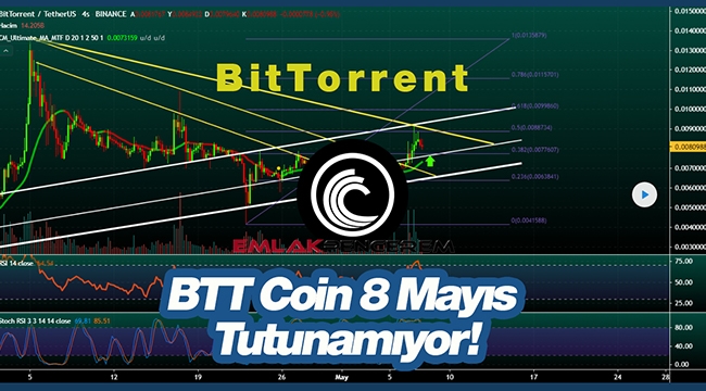 Üst kanal direncini kırmayı denedi kıramadı yavaş yavaş boşaltma yaparak orta trend çizgisine dönüş yapıyor. Destek noktası FİB 0.0077 kanal desteği ile aynı. Yeşil ok attığım yere kadar satışların yapılacağını düşünüyorum. Rsı ve Stokastik rahatladıktan sonra yukarıya yön verirse tekrar Long pozisyonuna abanacağım. Hedef eski ath seviyesi. Düşen Trend kıra kıra yükseliş yaşıyor. Sarı trend çizgileri düşen trendi belirttiklerim. Yeni oluşturduğu düşen trend ve FİB desteği arasında bir süre gidip 12 mayıs civarında tekrar kırmayı deneyebilir. Doge kaynaklı yükselişlerini yapamayan HOLO-DENT-WİN-BTT-STMX-ANKR-ONE-LİNA gibi coinler de dogeden çıkacak parayla hareketlenmesini beklediğim coinlerden. Bu yazdıklarım genel olarak grafikleri benzer indikatörleri de birbirlerine çok yakın gitmekte. 8 Mayıs günü Elon Musk'ın doge ile ilgili ne yapacağı merak konusu. Yarın dogeden çıkarsa para BTT de nasiplenecektir. Diğer coinler de tren kaçtı biz elimizdeki coinlerin yükselmesini bekleyelim. Sabır kazandırır sabırsız olmayalım en önemlisi de stratejinizi çok dikkatli yapın.