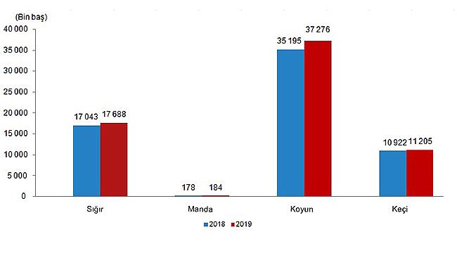 Büyükbaş hayvanlar arasında yer alan sığır sayısı %3,8 artarak 17 milyon 688 bin baş, manda sayısı %3,2 artarak 184 bin 192 baş olarak gerçekleşti.