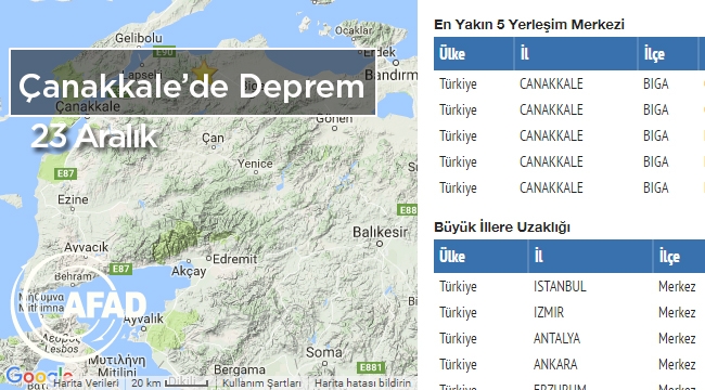 Konuya ilişkin son dakika verileri açıklaya AFAD Çanakkale depreminin merkez üssünün Biga ilçesi olduğunu, sabah saat 09:02 sıralarında yaşanan depremin yerin yaklaşık 7 kilometre derinlerde meydana geldiğinini duyrdu.