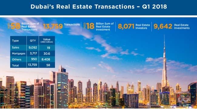Dubai Arazi Bölümü (DLD) Emlak Araştırmaları ve Araştırma Dairesi tarafından yayınlanan rapora göre, Q1 2018, 19.6 milyon AED, 30.6 milyar AED değerinde 3.717 mortgage işlemi ve 8.408 milyar AED değerindeki 950 işlemle ilgili toplam 9,092 satış işlemi gördü.