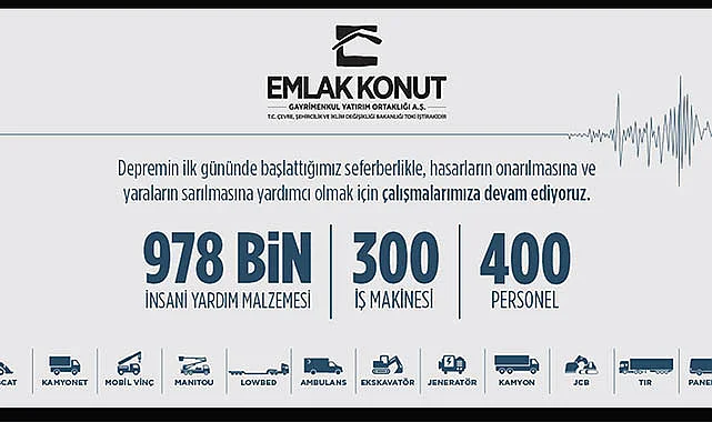 Emlak Konut GYO sosyal medya hesabından yaptığı paylaşımda, "Depremin ilk gününde başlattığımız seferberlikle, afet bölgelerine toplamda 978 bin insani yardım malzemesi, 300’e yakın iş makinesi ve 400’den fazla personelimiz ile destek vermeye devam ediyoruz. Yaraları sarmak için gayret eden tüm çalışma arkadaşlarımıza minnettarız." dedi.