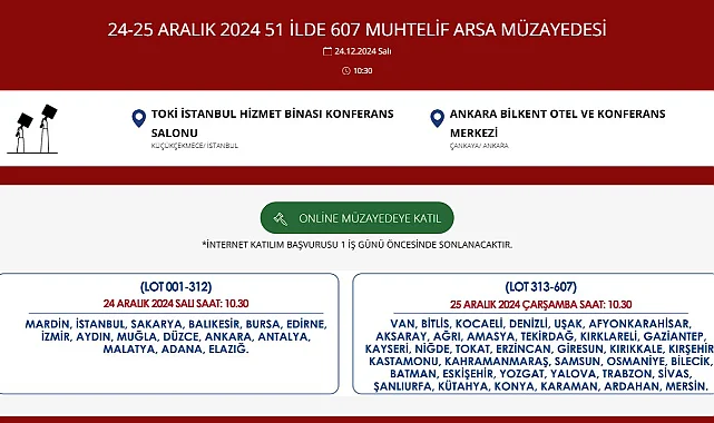 TOKİ tarafından 51 ili kapsayan toplam 607 adet çeşitli büyüklüklerde arsalar açık artırma yöntemiyle Emlak Müzayede üzerinden satışa çıkıyor. İki günde satılacak arsalar ihalede teklif verilmek suretiyle artırım yapılacak. TOKİ arsa ihalesi 24-25 Aralık 2024 tarihinde büüyk bir katılımla gerçekleşmesi planlanıyor. Çok sayıda yatırımcı arsalara teklif vermek için ihale tarihini bekliyor.