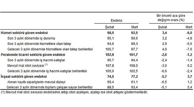 Mevsim etkilerinden arındırılmış güven endeksi Mart ayında bir önceki aya göre; hizmet sektöründe %6,0 ve perakende ticaret sektöründe %1,2 azalırken, inşaat sektöründe %3,7 arttı.