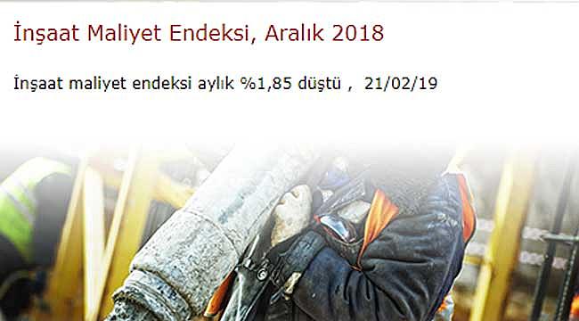 Türkiye İstatistik Kurumu (TÜİK) İnşaat Maliyet Endeksi, Aralık 2018 verilerini açıkladı. Buna göre İnşaat maliyet endeksi Aralıkta aylık %1,85 düştü.