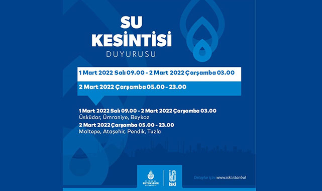 Ömerli İçmesuyu Arıtma Tesisleri’ne su sağlayan isale hattında meydana gelen arızanın onarımı yapılacağından, 1 Mart 2022 Salı günü 09.00 ila 2 Mart Çarşamba günü 03.00 saatleri arasında Üsküdar, Ümraniye ve Beykoz ilçelerinin bir kısmına 18 saat süreyle; yine aynı çalışmanın devamında 2 Mart 2022 Çarşamba günü 05.00 ila 23.00 saatleri arasında Ataşehir, Maltepe, Pendik ve Tuzla ilçelerinin bazı mahallelerine 18 saat süreyle su verilemeyecektir.