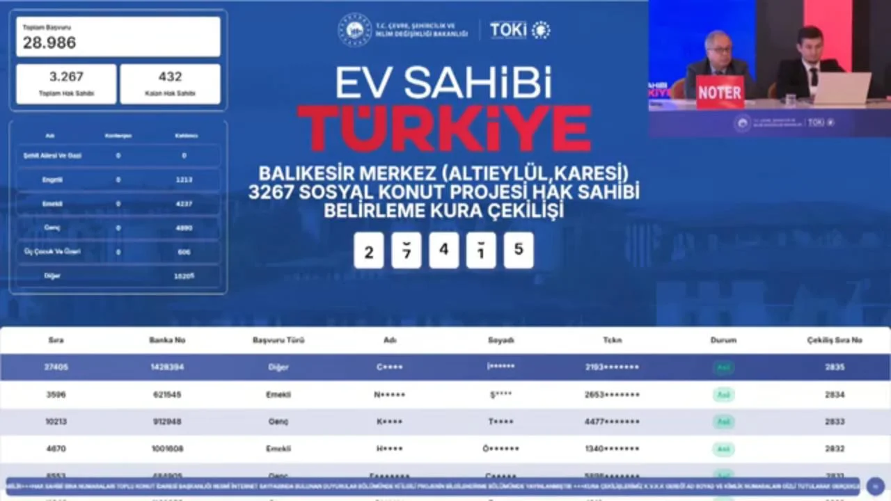 Karesi ve Altıeylül TOKİ kura çekilişi, tam bir şeffaflık içerisinde noter gözetiminde gerçekleştirildi. Başvuru sahiplerinin heyecanla takip ettiği kura anları, TOKİ'nin resmi YouTube kanalı üzerinden canlı olarak yayınlandı. Çekiliş sonucunda hem asil hem de yedek hak sahibi listeleri oluşturuldu. Yetkililer, sürecin tüm aşamalarının şeffaf bir şekilde yürütüldüğünü vurguladı.