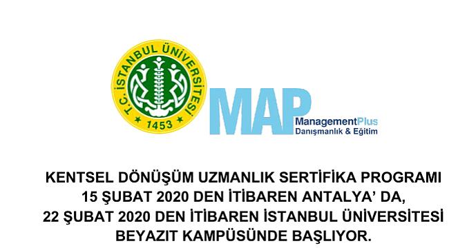 Management Plus ve İstanbul Üniversitesi (SEM) işbirliği ile düzenlenen “Kentsel Dönüşüm Uzmanlık Sertifika Programının” 22 si 15 Şubat 2020 de Antalya’ da, 23 Program ise 22 Şubat 2020 de İstanbul Üniversitesi Beyazıt Kampüsünde Cumartesi-Pazar günleri dersler olacak şekilde başlayacak.