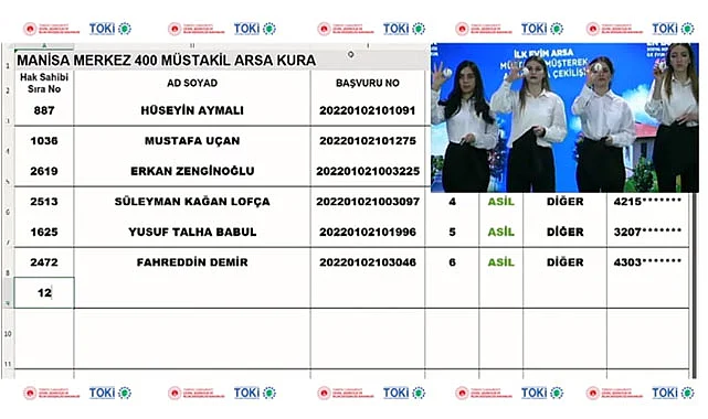 Manisa'da müstakil arsa sahibi olmak için uzun vadeli ve düşük faizli kredi kullanarak TOKİ arsa başvuruları arasından yapılan kura çekilişi sonuçları canlı yayında belli oldu. Ankara 15. Noter huzurunda tamamlanan Manisa TOKİ 400 adet olarak tahsis edilen müstakil arsa kuraları çekilerek kura sonuçlarına ilişkin isim listeleri açıklandı.