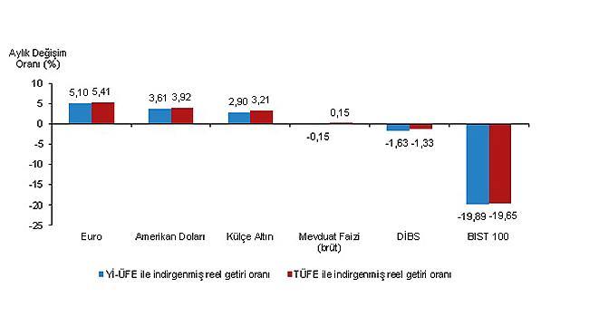 Yİ-ÜFE ile indirgendiğinde; yatırım araçlarından Amerikan Doları %3,61 ve külçe altın %2,90 oranlarında kazandırırken; mevduat faizi (brüt) %0,15, Devlet İç Borçlanma Senetleri (DİBS) %1,63 ve BIST 100 endeksi %19,89 oranlarında yatırımcısına kaybettirdi. TÜFE ile indirgendiğinde Amerikan Doları %3,92, külçe altın %3,21 ve mevduat faizi (brüt) %0,15 oranlarında kazandırırken; DİBS %1,33 ve BIST 100 endeksi %19,65 oranlarında yatırımcısına kaybettirdi.
