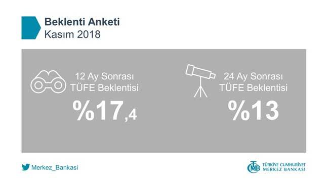2018 yılı Kasım ayı için tüketici enflasyonu (TÜFE) beklentisi bir önceki anket döneminde yüzde 1,31 iken, bu anket döneminde yüzde 0,88 olmuştur. Aralık ayı TÜFE beklentisi aynı anket dönemlerinde sırasıyla yüzde 0,98 ve yüzde 0,77 olmuştur. 2019 yılı Ocak ayı TÜFE beklentisi ise yüzde 1,71 olarak gerçekleşmiştir.