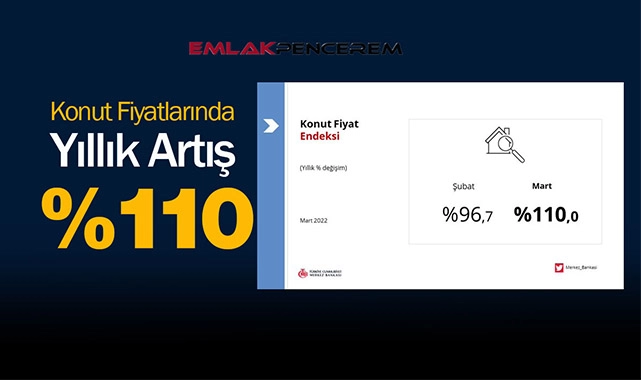 Türkiye Cumhuriyeti Merkez Bankası (TCMB) Konut Fiyat Endeksi (KFE) 2022 yılı Mart ayına ilişkin konut fiyatlarına ilişkin endeksi açıkladı. Buna göre 2022 yılı Mart ayında bir önceki aya göre yüzde 9,3 oranında artan KFE, bir önceki yılın aynı ayına göre nominal olarak yüzde 110,0, reel olarak ise yüzde 29,7 oranında artmıştır.